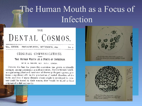 Enfeksiyon odağı terimini ilk kez kullanan mikrobiyolog ve diş hekimi W.D. Miller’in 1891 de Lancet ve Dental Cosmos’da “Bir enfeksiyon odağı olarak insan ağzı” adlı makale serisi yayınlanmıştır. 1800’lerin sonu 1900’lerin başındaki pek çok tıbbi ve ağız içine ait gözlemsel çalışmalar, enfekte dişlerin sistemik sağlığı nasıl etkilediğini hatta diş çekiminin sistemik hastalığı tedavi ettiğini tanımlamıştır.1946’da ilk defa L.W. Burket sistemik hastalıkların muhtemel kaynağı olarak periodontal enfeksiyondan bahsetmiş ve hastalıklı dişeti dokusundan gelişen kandaki bakteri istilasının eklem lezyonlarındaki önemini ifade etmiştir.